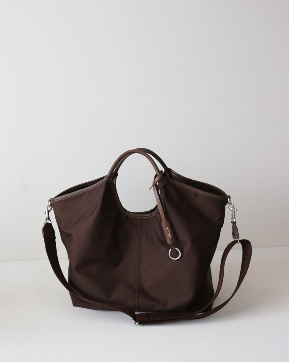 ●お届け日 2月10日より順次発送予定 . ※付属はタグ、リングに変更となります。リニューアル後はLOLO TWOWAYと同じ仕様です。 ■デザイン お仕事も休日も両方のシーンで使いやすい、 シンプルでオールマイティーなトートバッグです。 本体には扱いやすいナイロン素材を使用し 長く持っても疲れにくいよう軽量に仕上げました。 ハンドルは強度と持ちやすさ、見た目のバランスを考え、牛革の芯入りハンドルを採用。 使いたい時に出し入れがスムーズになるようにポケットを多く配置。 サイド部分にある立体ポケットは、バックを肩に掛けたままでも携帯などを出し入れしやすく、対面のサイドポケットはボトルホルダーや傘立てとしてお使いいただけます。 デザインはお仕事にも休日にも使うことを考え、スタイリングのしやすいシンプルな見た目とディテールにこだわりました。 荷物の少ない日や休日は、サイドに着いたホックを留めてスマートな形に変更できるのもおすすめポイントです。 カジュアルになりがちな素材感のバッグを、レザーとのコンビネーションによって 綺麗目カジュアルな印象に。 ソフトでしなやかなナイロンの素材感に本革を合わせ、シンプルな見た目の中にも雰囲気を大切にしたデザインです。 ■素材 バッグの素材に選んだのは高密度に織ったコーデュラファブリック。耐久性、頑丈さ、万能さの代名詞となっている高機能素材で摩擦に強く、毎日使うことが多く擦れが起こりやすいお仕事バッグにも最適です。 両面に撥水加工・撥水加工が施されているので、雨の日や突然の雨にも対応してくれる、活躍シーンの多いバッグです。そして更にお伝えしたいのがその軽さ。特に大きなサイズのバッグは面積が多い分重くなりがちですが、想像以上の軽さが魅力。 バック自体が軽く、ご負担なくお使いいただけます。 ■サイズ:約 横幅30~46 ×高さ25~32×マチ12 cm ■ハンドル:約42 + 8cm ■重量:約390g 【対応しているもの】 ■A4サイズ ■長財布 ■ペットボトル500nl 縦・横 ■パソコン 14インチ 【仕様】 ■内ポケット(オープン)4 ■立体ポケット(オープン)1 ■ボトル(傘)ホルダー 1 【キャンセル・返品について】 申し訳ございませんが、お客様のご都合によるキャンセル・返品は 受け付けておりません。