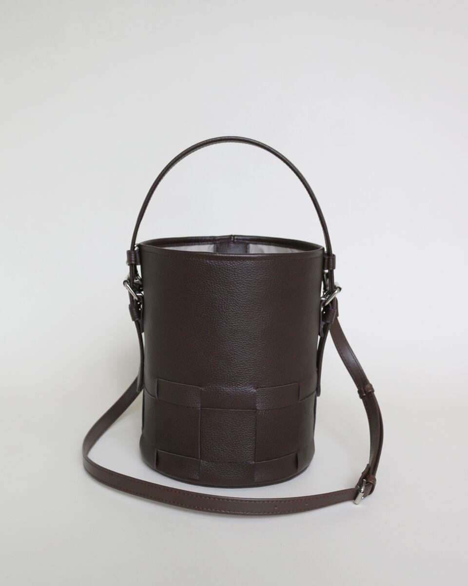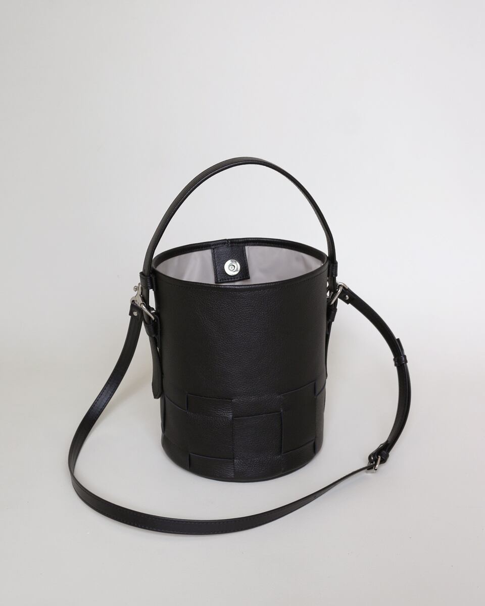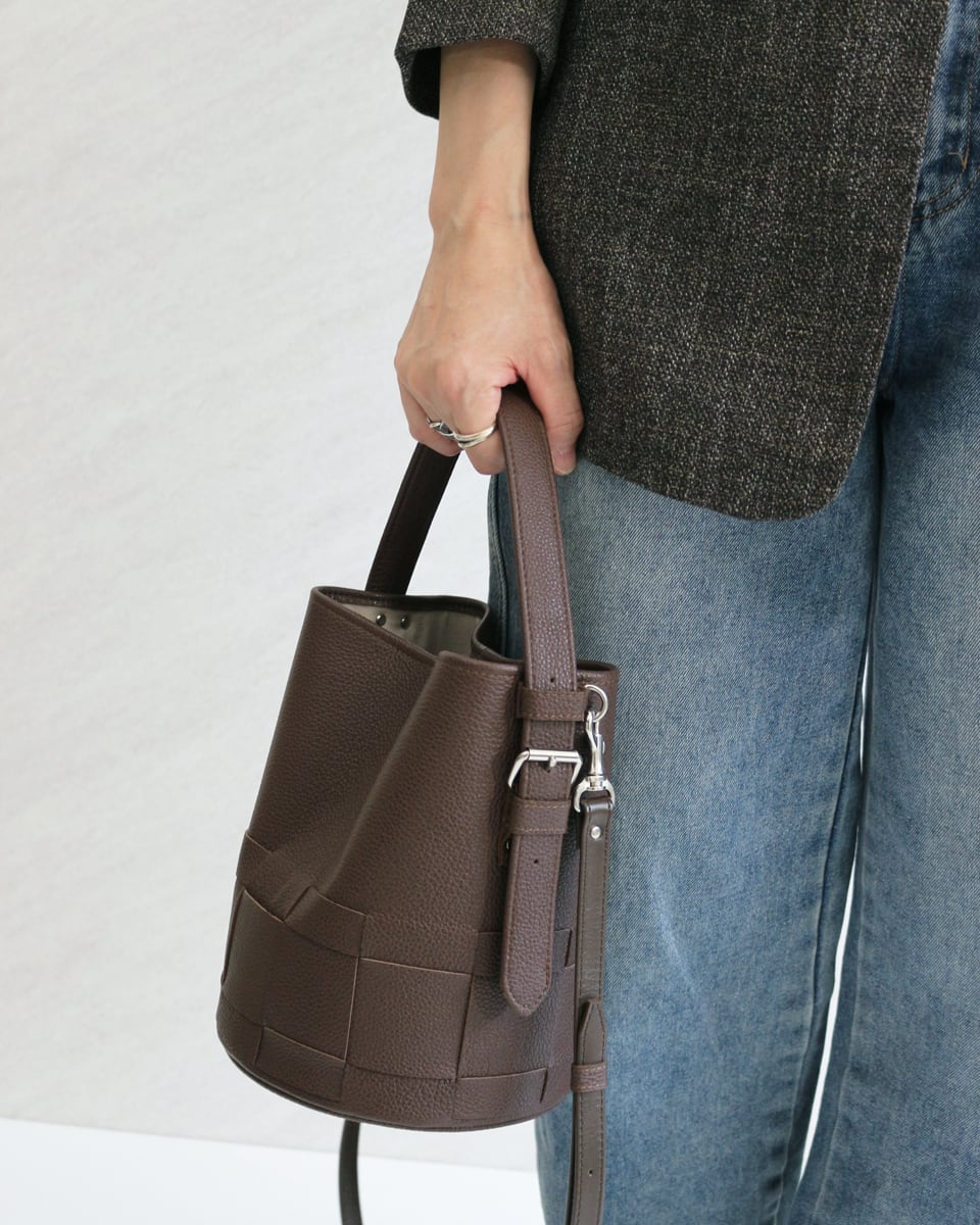 シンプルなバケツ型に編み目を施したレザーバック。