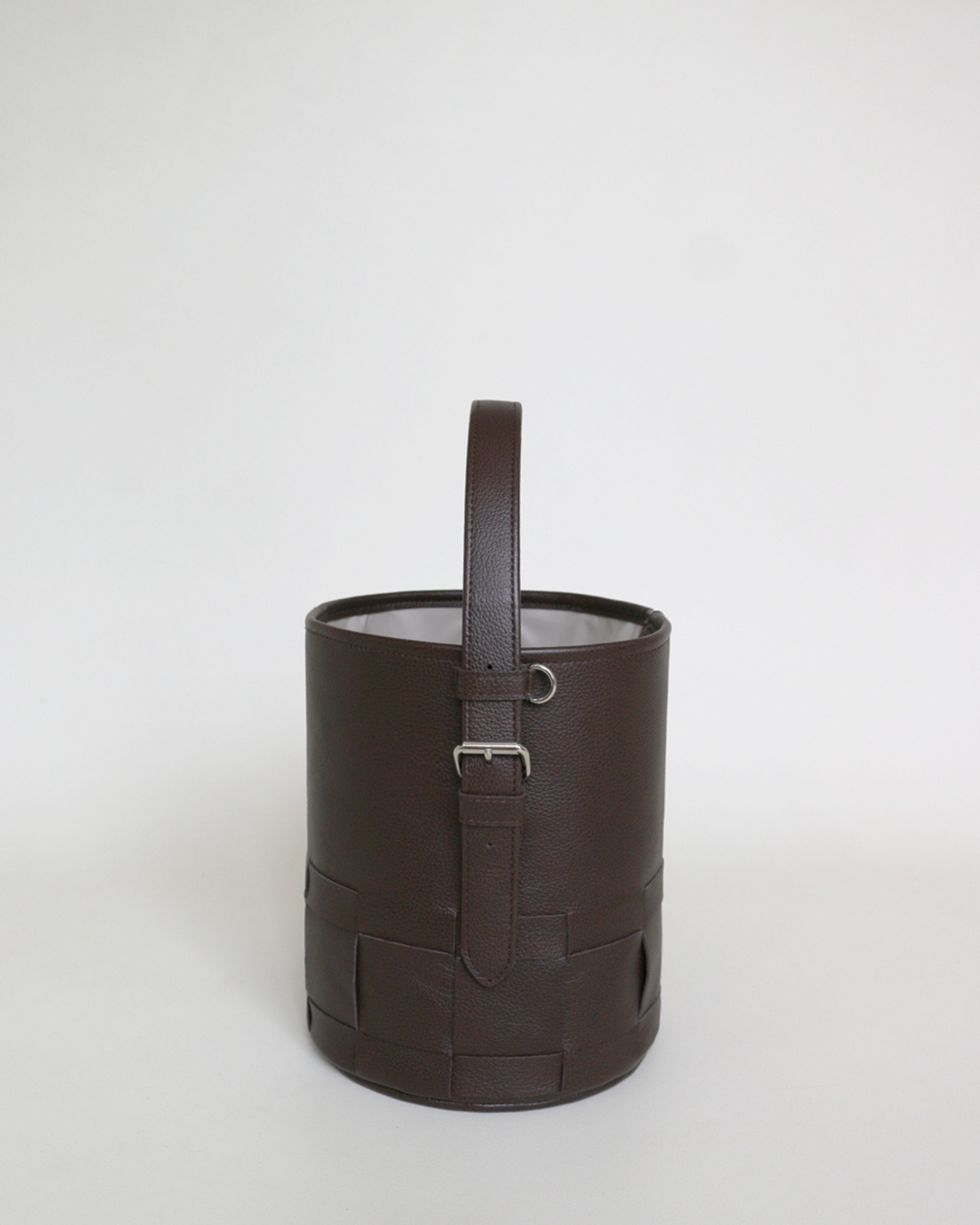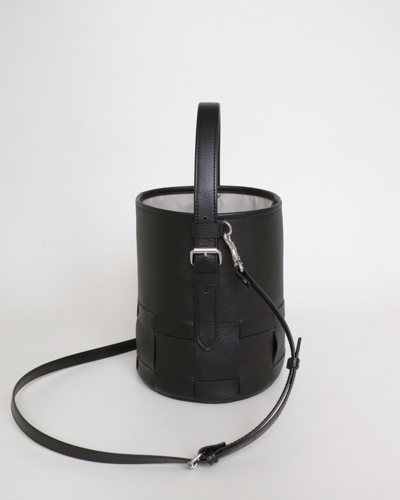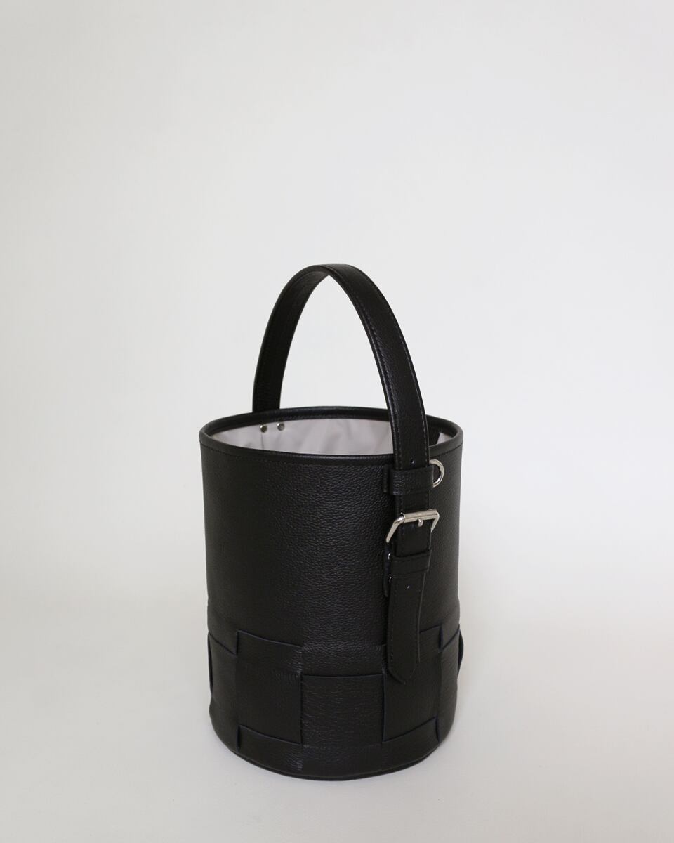 シンプルなバケツ型に編み目を施したレザーバック。