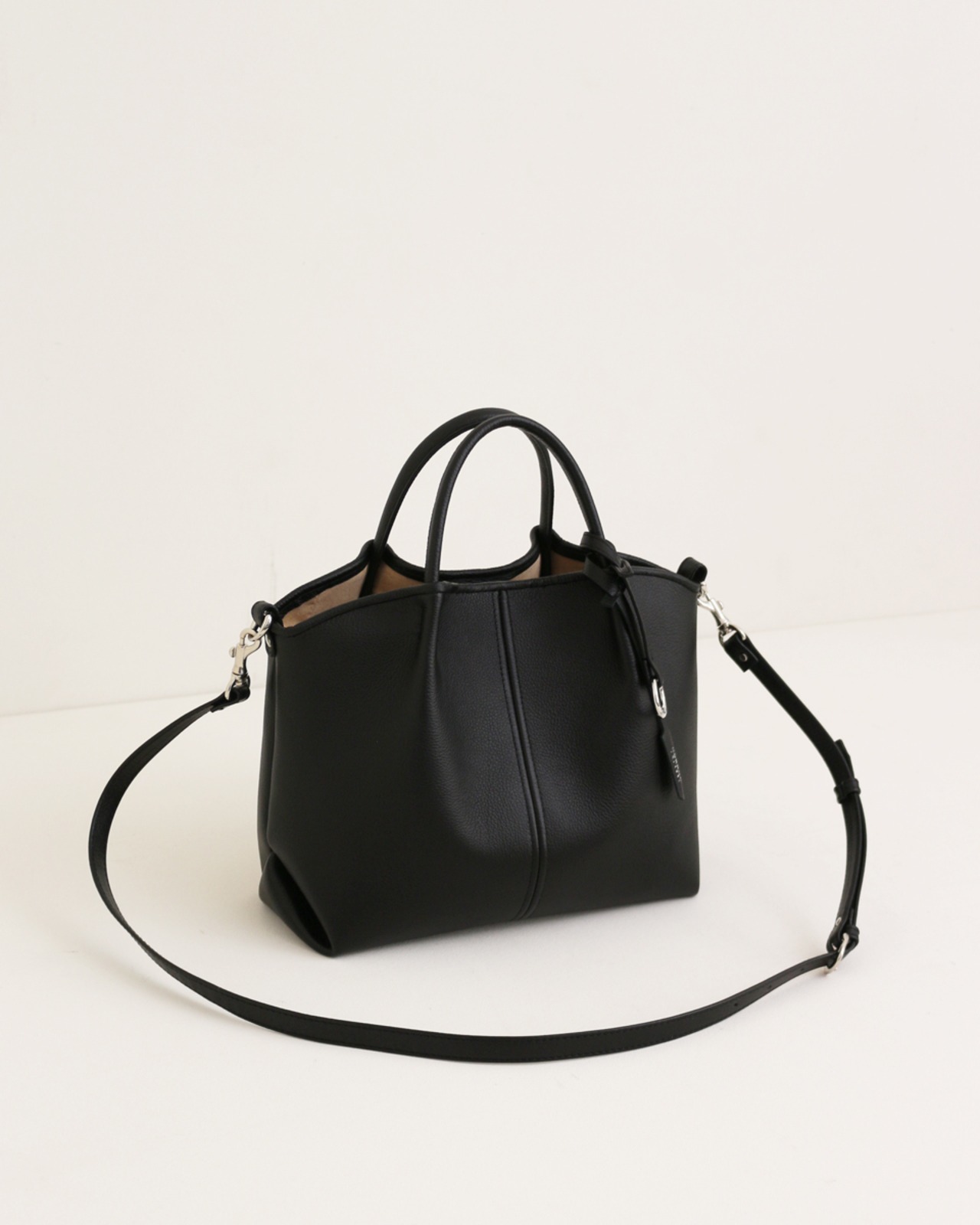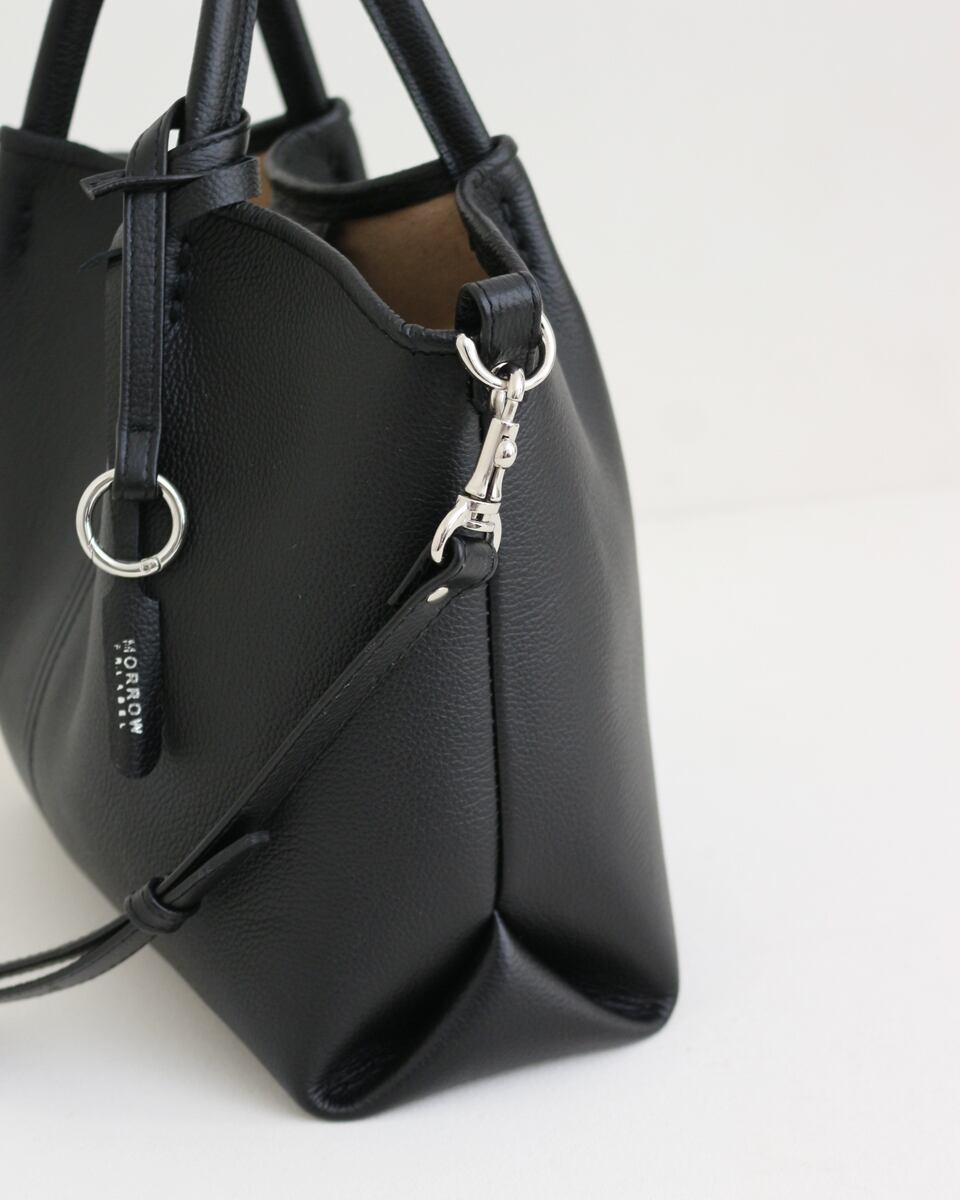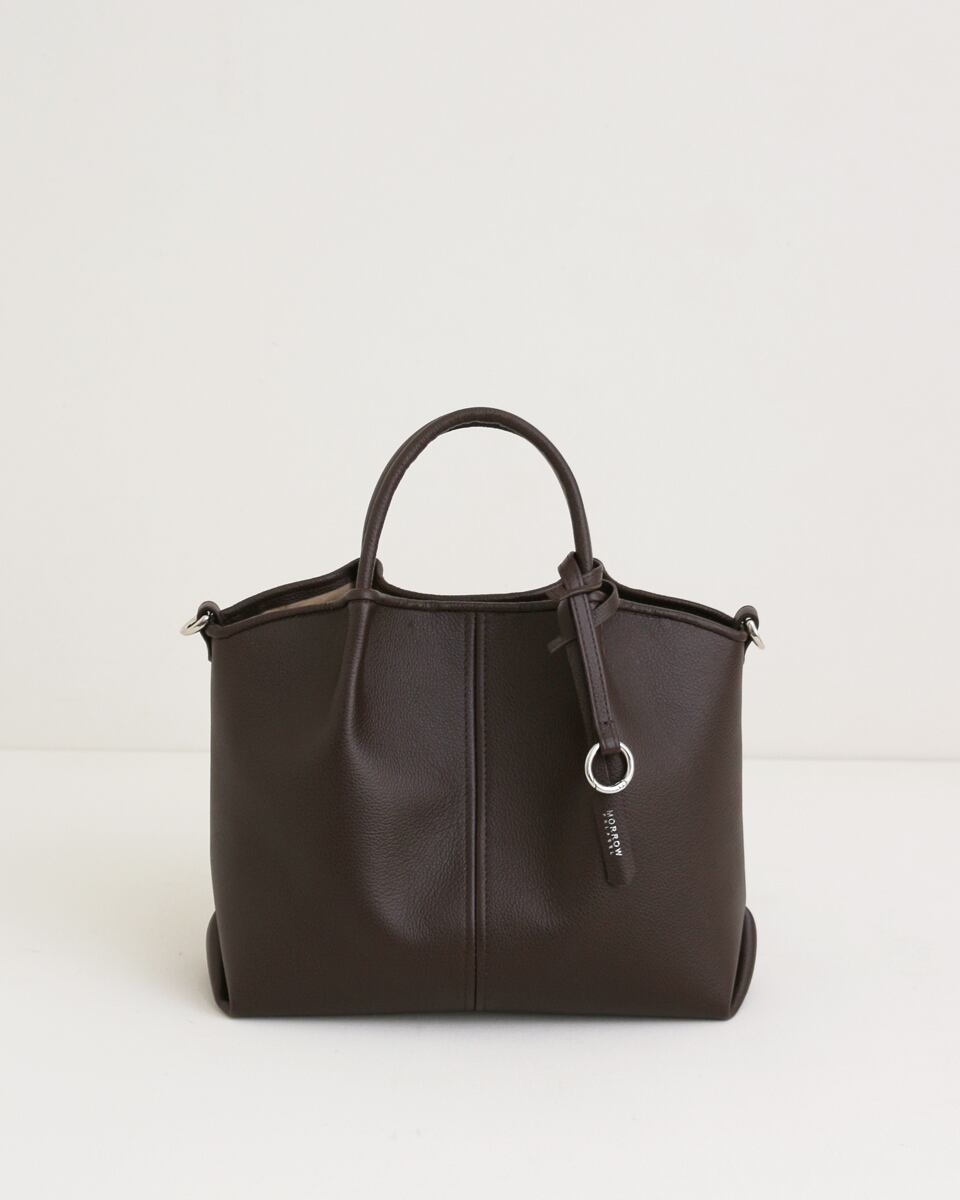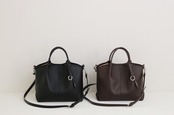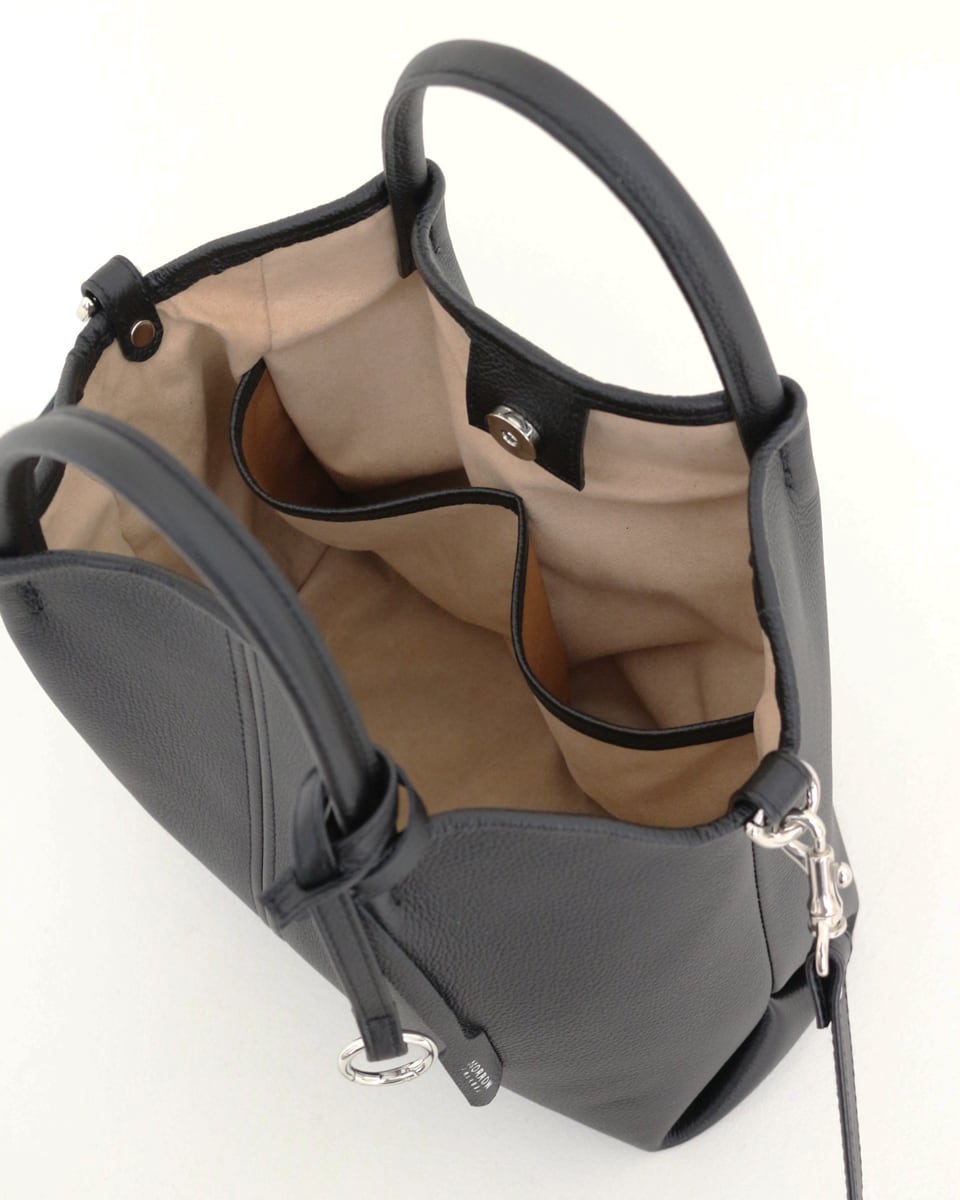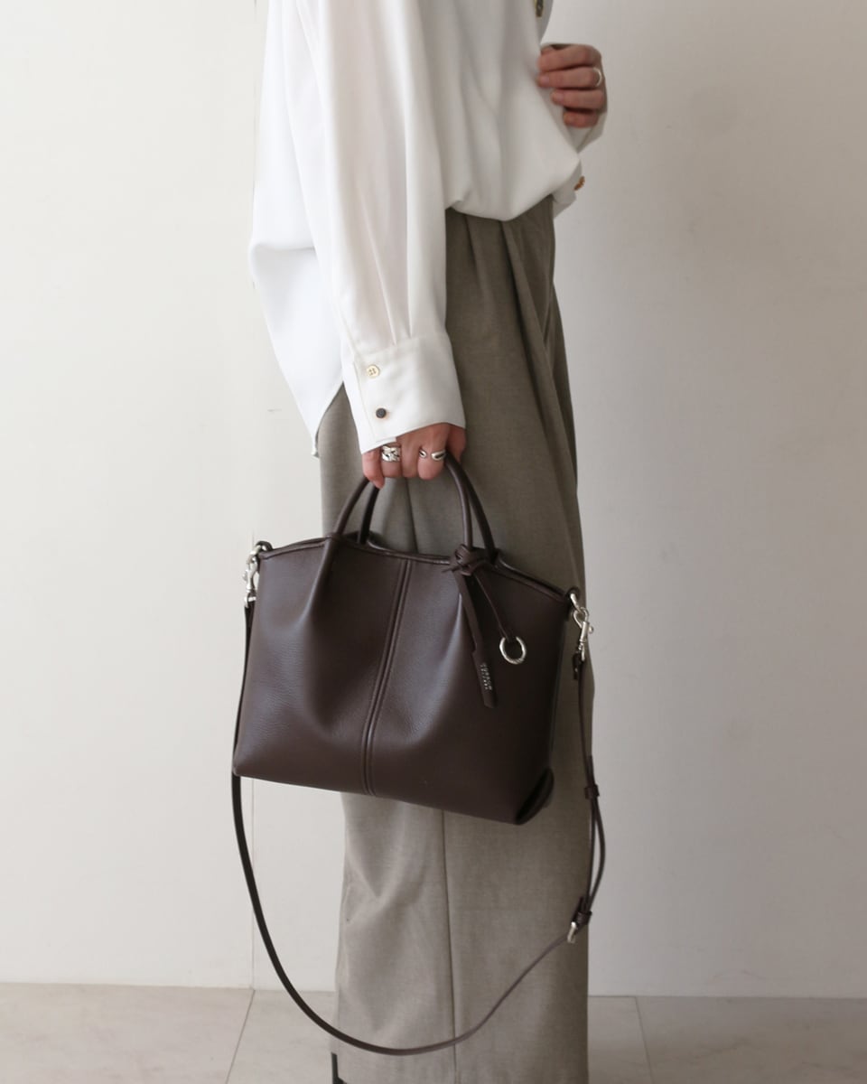 ON/OFFどちらも対応できるミドルサイズのレザーハンドバッグ。