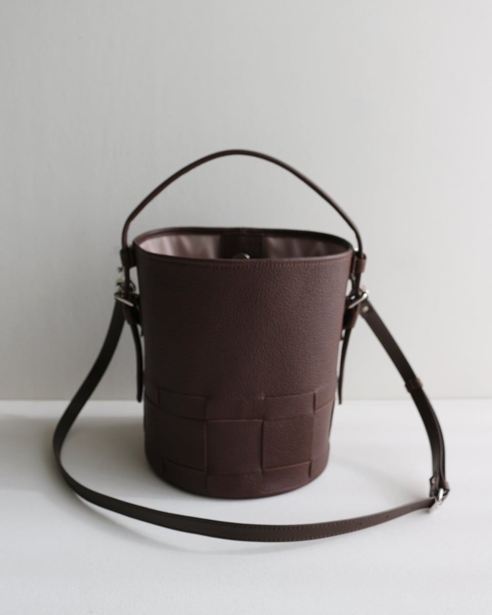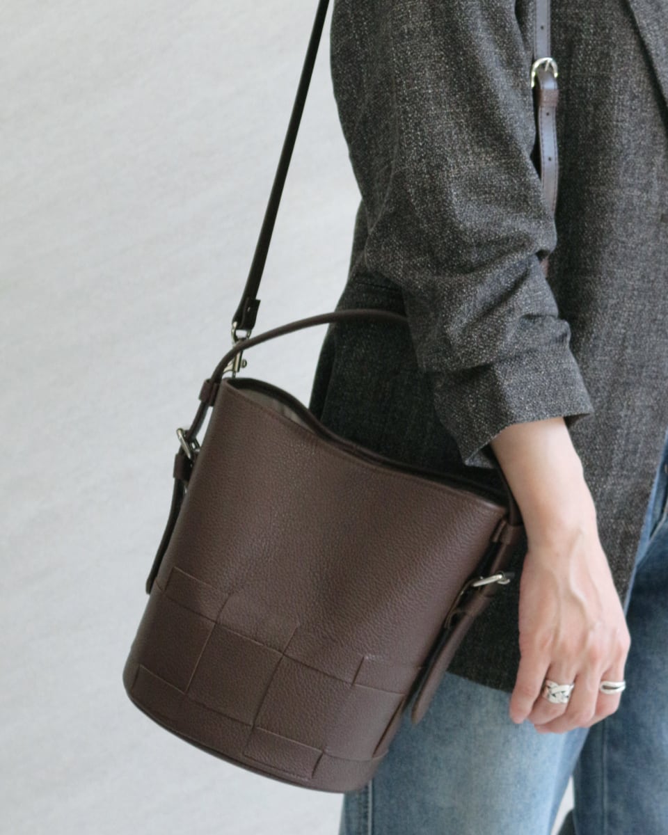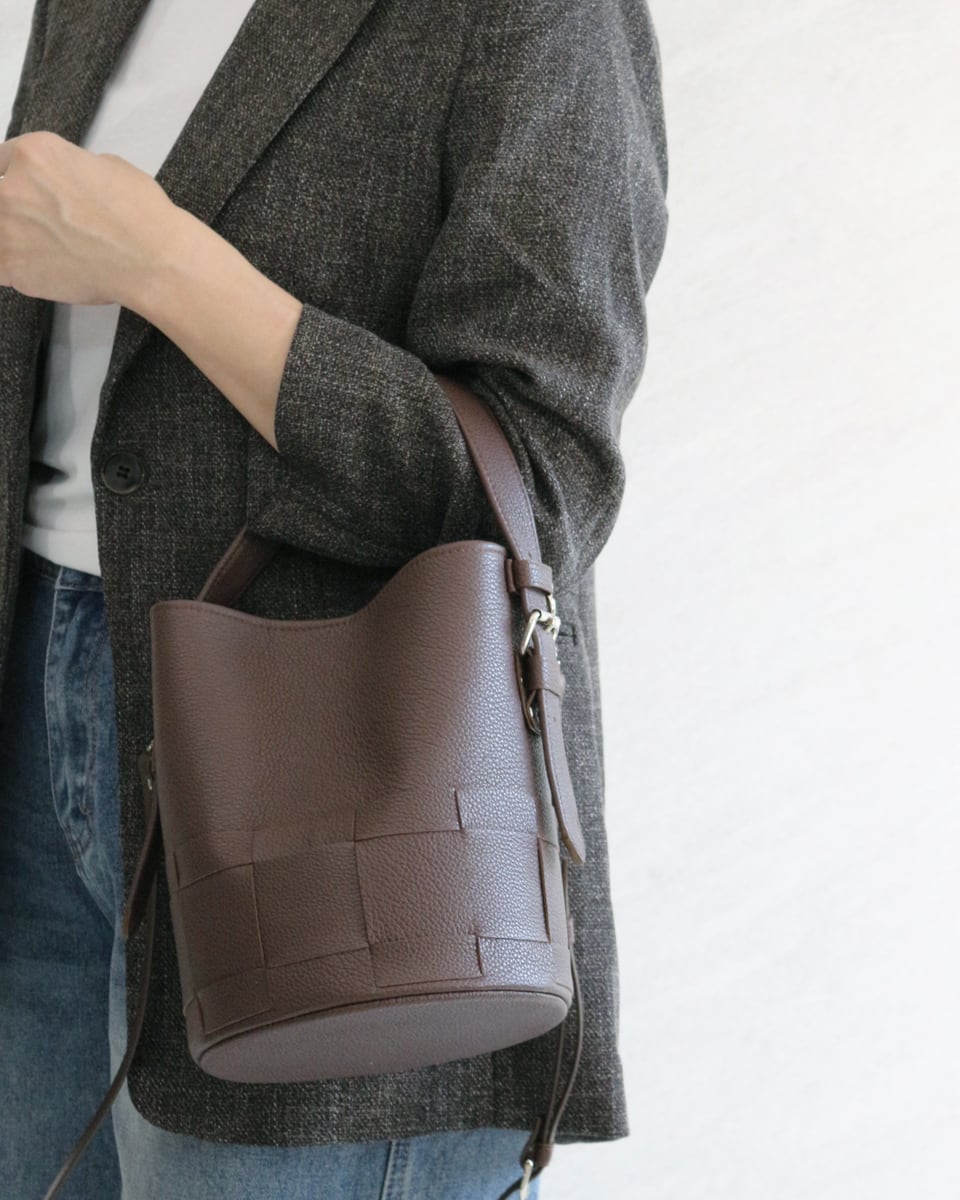 シンプルなバケツ型に編み目を施したレザーバック。