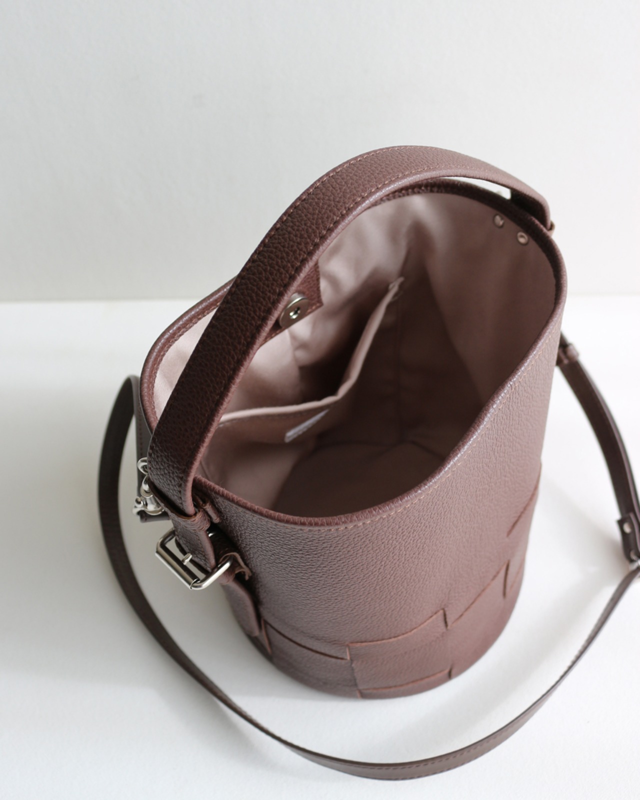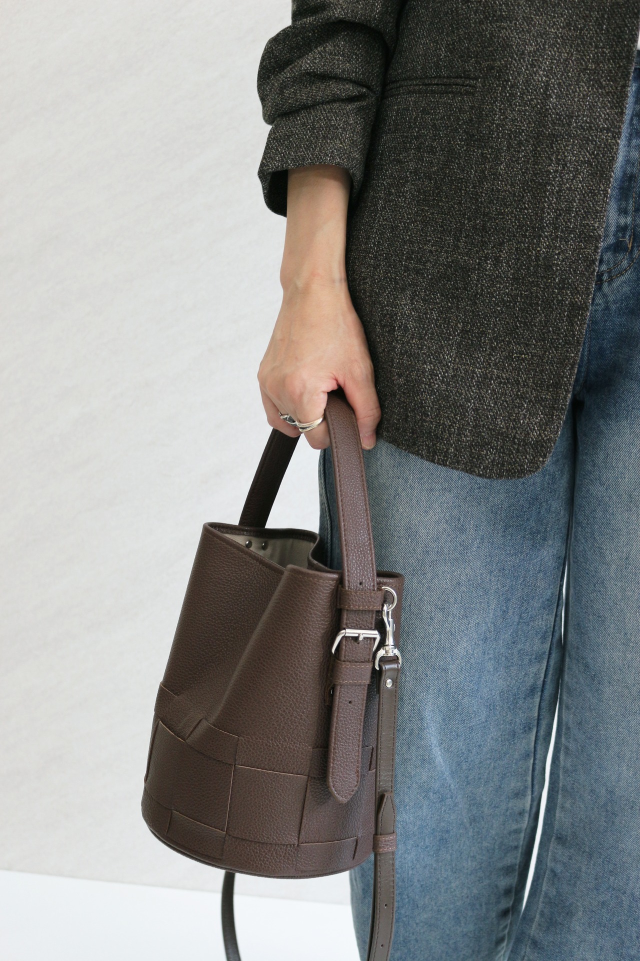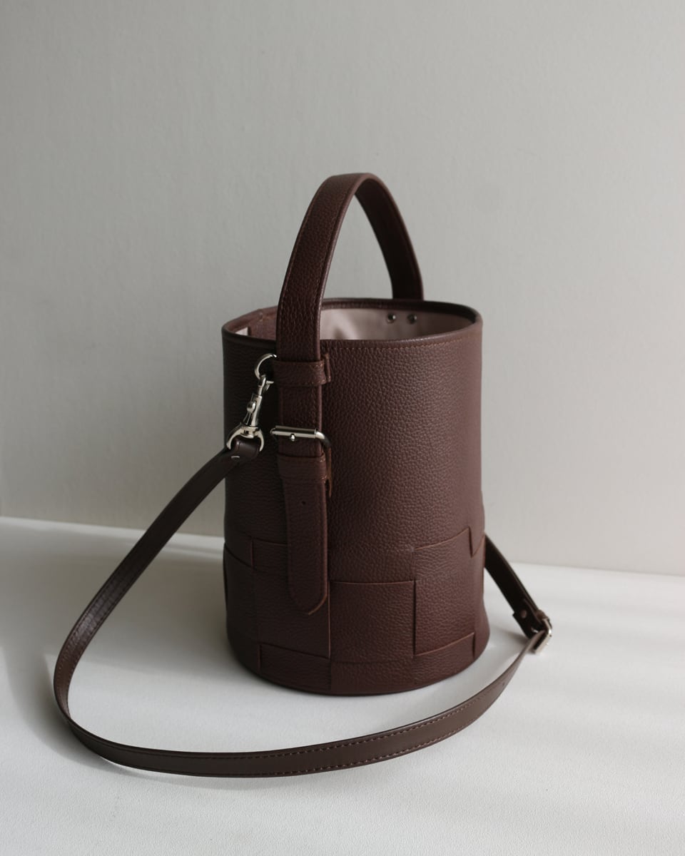 シンプルなバケツ型に編み目を施したレザーバック。