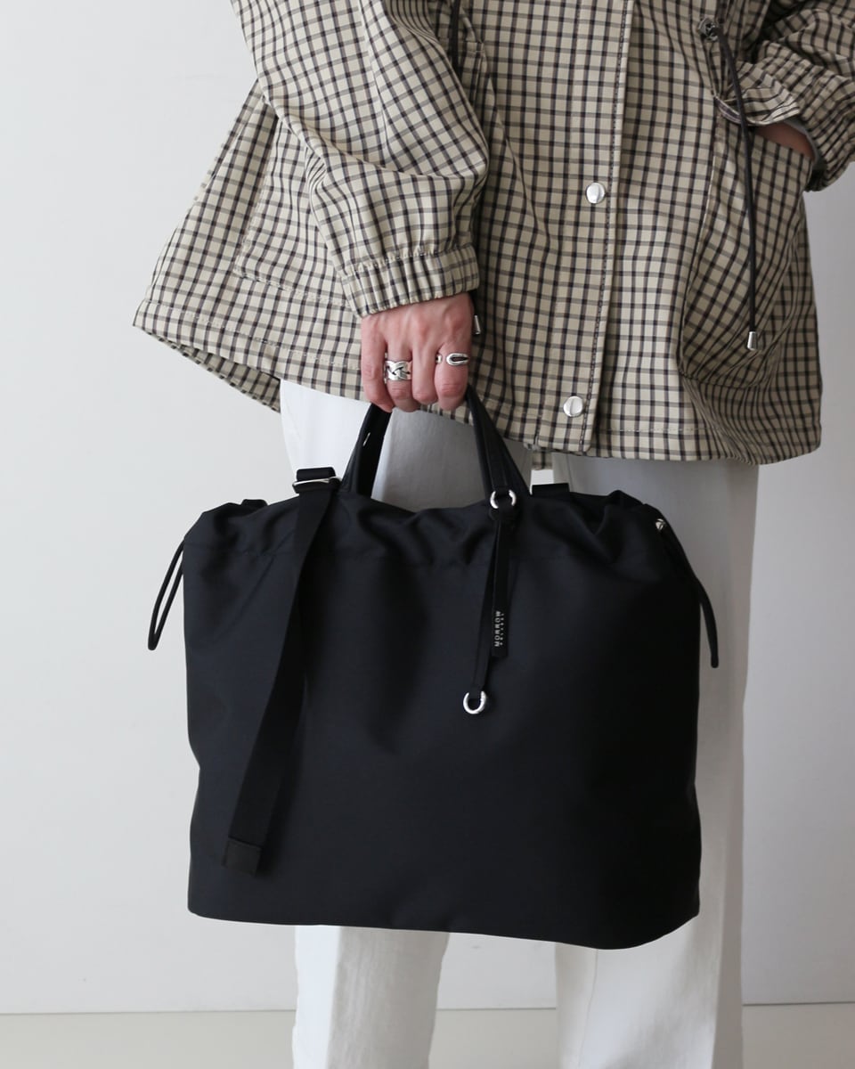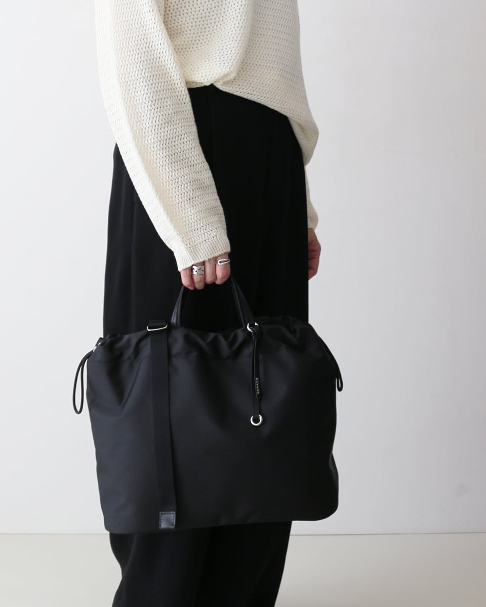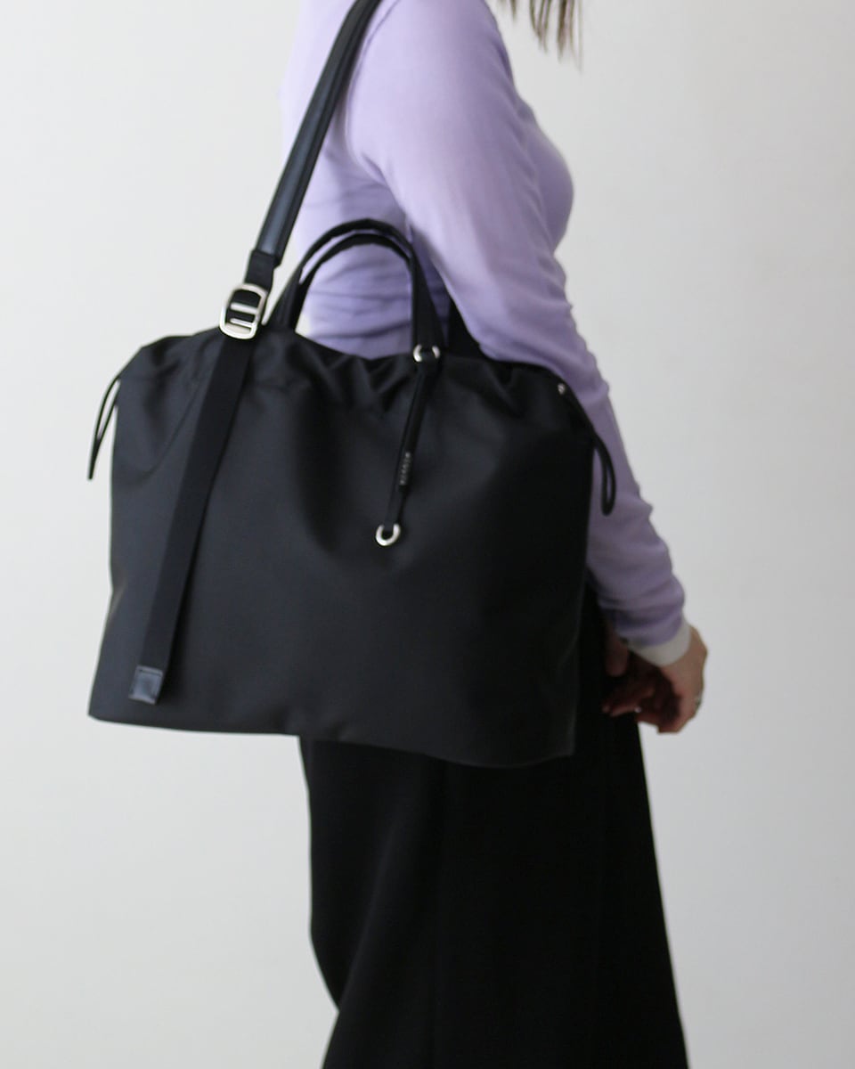 柔らかな巾着フォルムに、ノートPCやA4書類が収まる実用性をプラス。