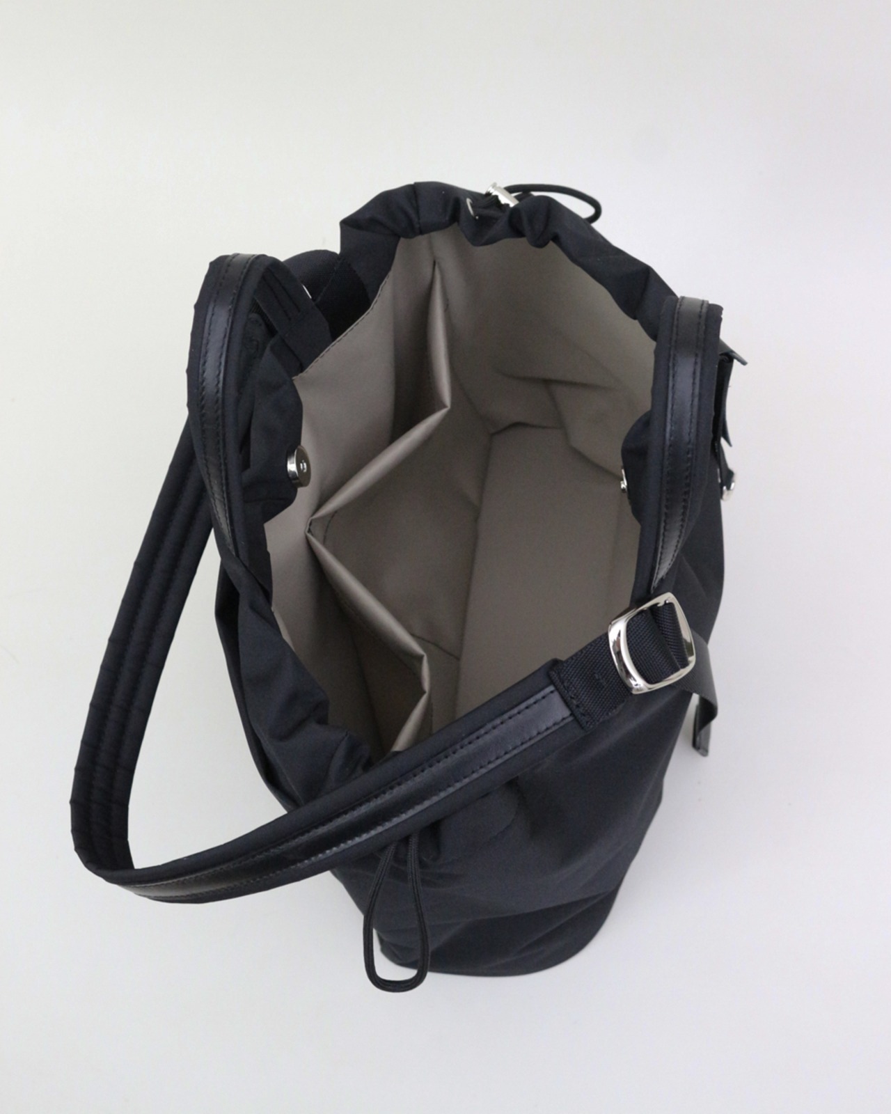 開口部は巾着仕様。中身をしっかり守りながら、ドローコードでシルエットの変化も楽しめます。